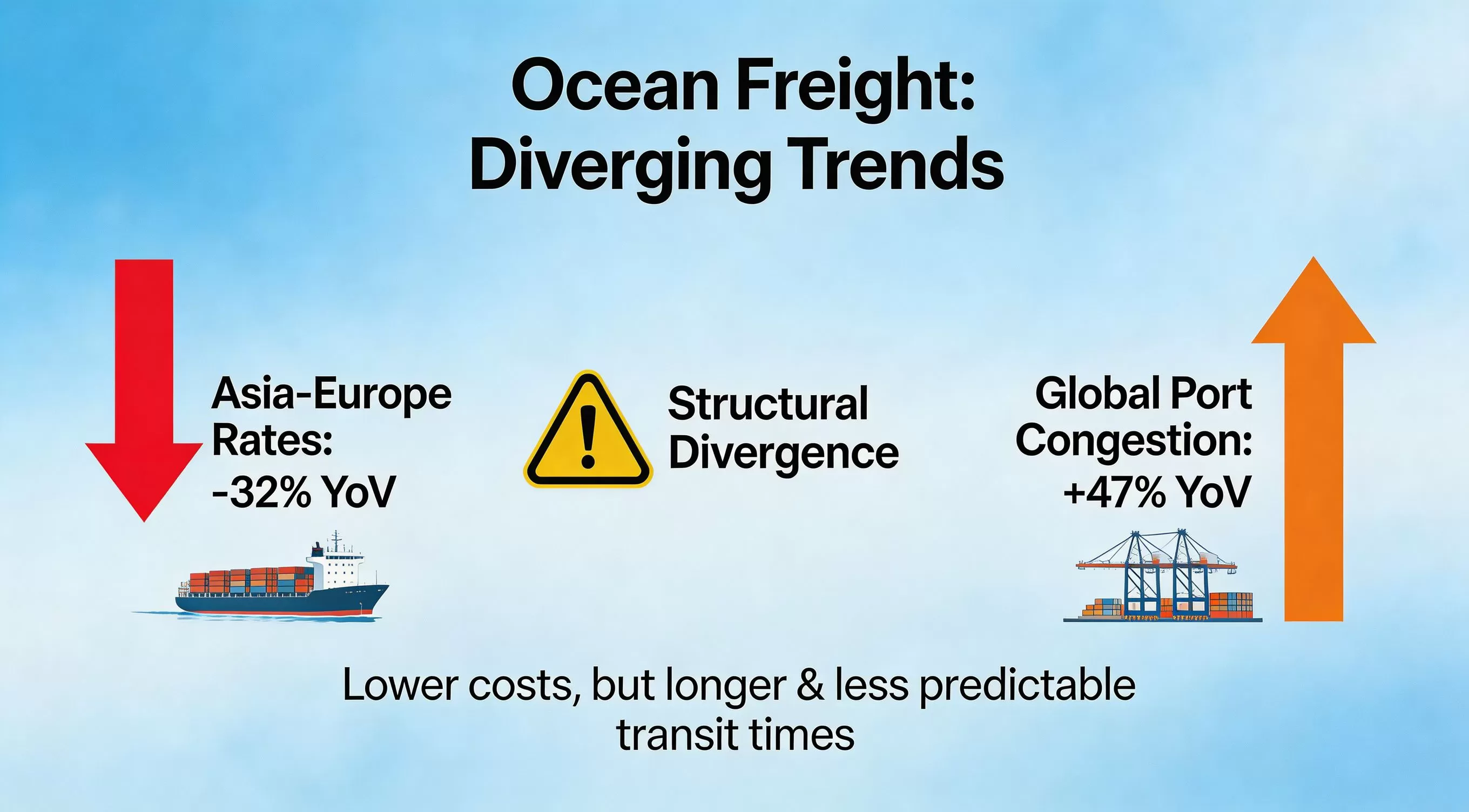 Recent Drewry data shows Asia-Europe freight rates down 32% year-on-year, while the Global Port Congestion Index has surged 47% year-on-year — a structural divergence between shipping costs and delivery reliability.