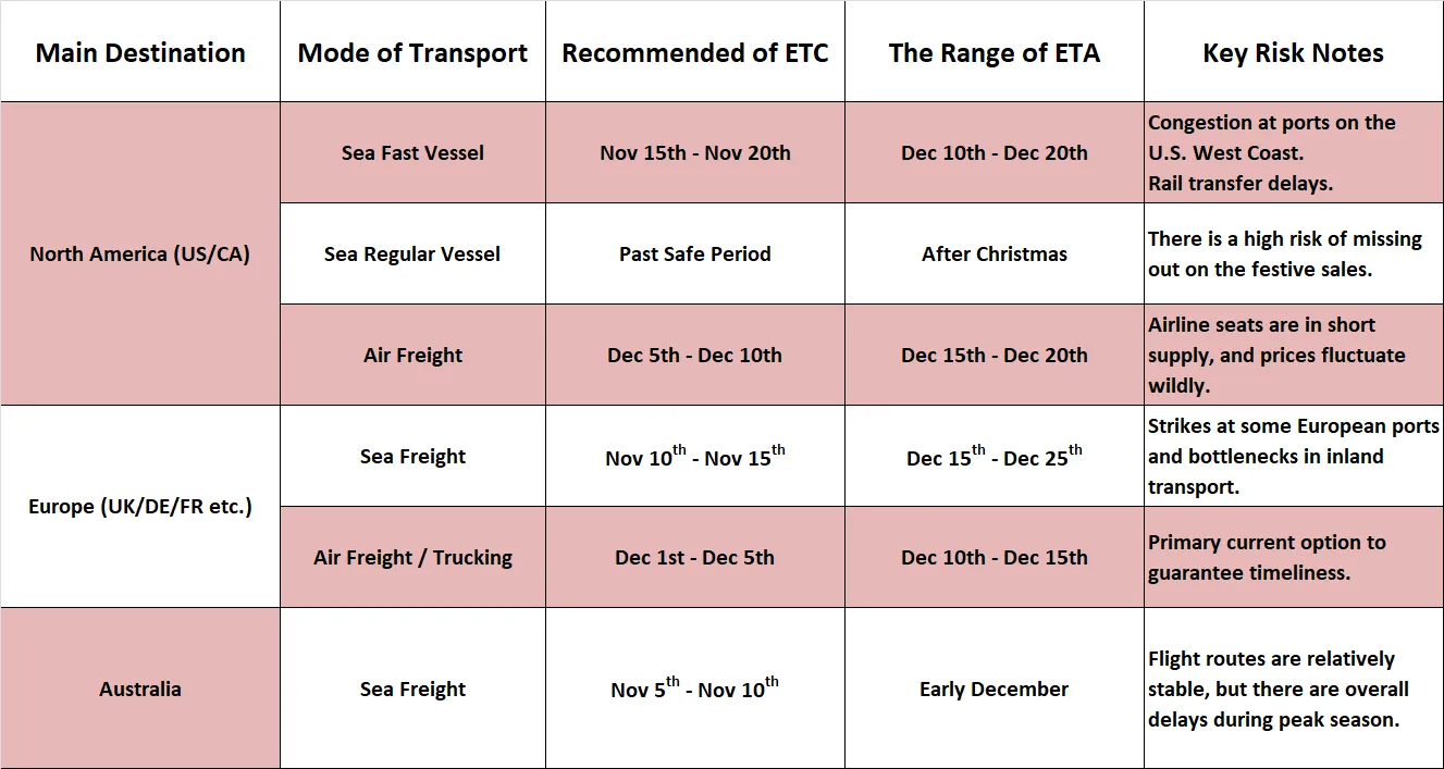 Based on current market capacity and general transit times, we strongly advise scheduling your shipments with reference to the timeline below. **The "Final Cut-off Date" refers to the latest date by which goods should be packed, customs cleared, and handed over to the carrier, not the date of order placement or production completion.